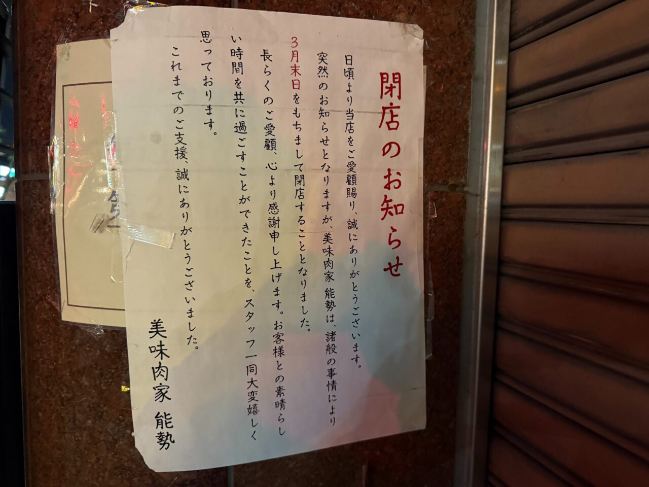 貼り紙には「諸般の事情により、閉店することになりました」とあります。