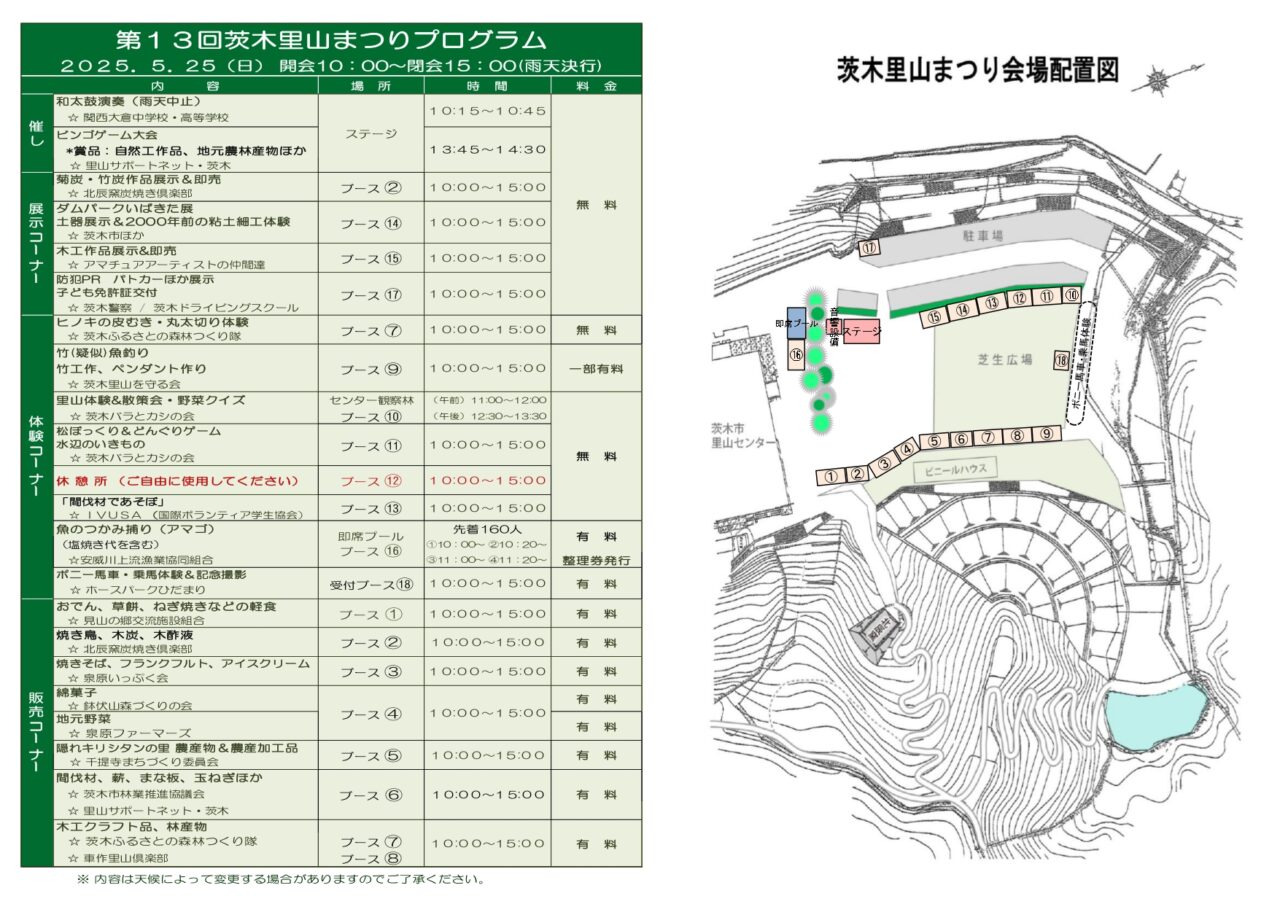 体験コーナー:魚のつかみ捕り(有料)塩焼き代含む先着160名※整理券発行、ヒノキの皮むき・丸太切り体験、ポニー乗馬体験&記念撮影(有料)ほか
