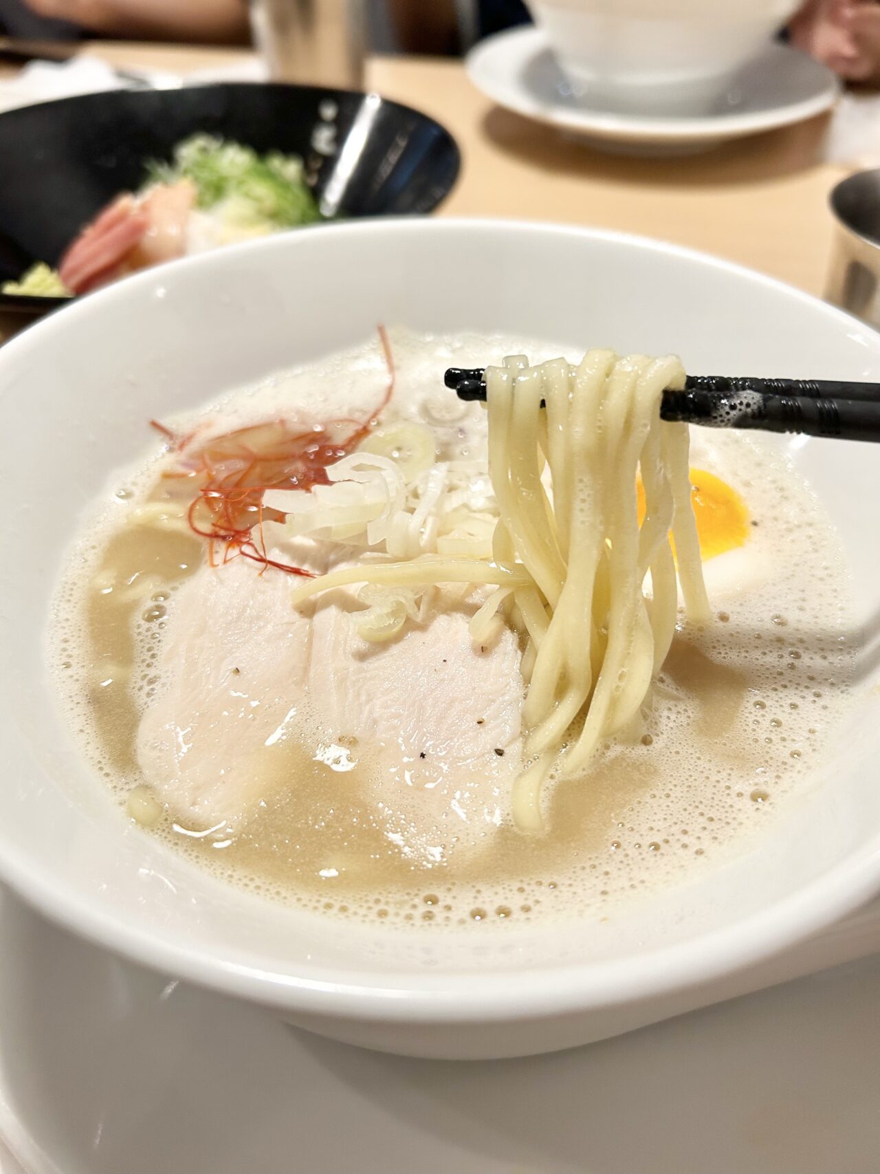 濃厚かつクリーミーなスープに、麺は中太平打ち麺。