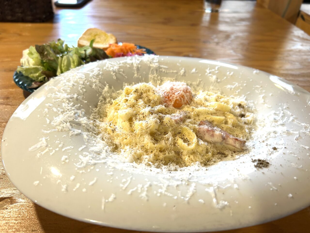 メニューはQRコードから注文するシステムで、今回は一番人気という「3種のチーズとベーコンのカルボナーラ(1,100円)」のサラダセット(プラス200円)を注文しました。