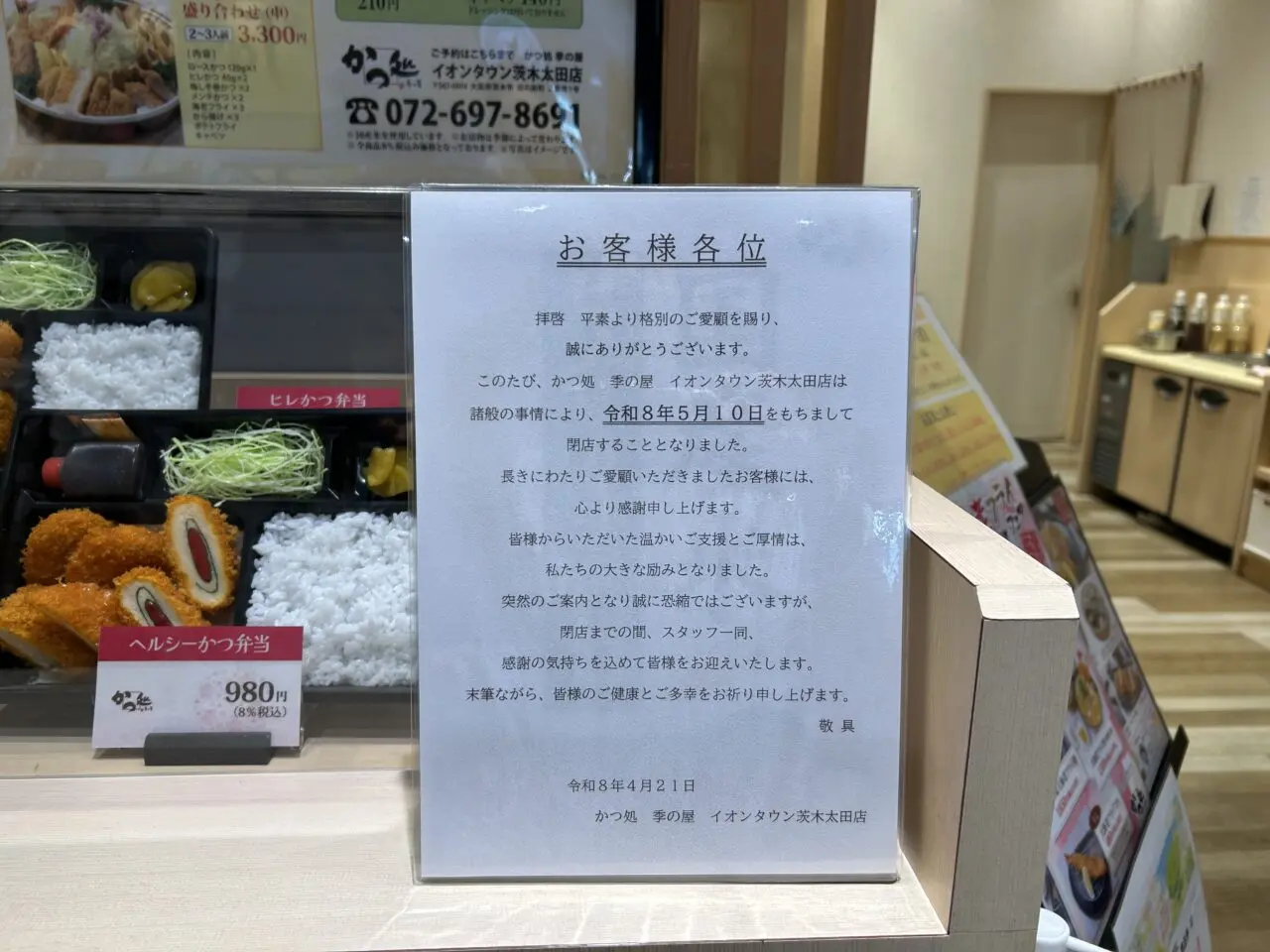 かつ処 季の屋 イオンタウン茨木太田店は諸般の事情により、令和8年5月10日をもちまして閉店することとなりました。長きにわたりご愛顧いただきましたお客様には心より感謝申し上げます。